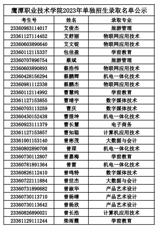鹰潭职业技术学院2023年单独考试录取名单